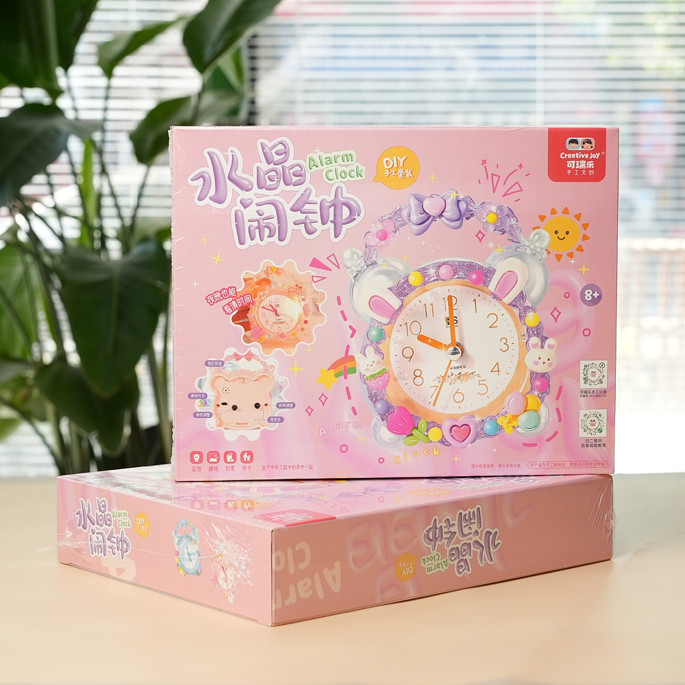 这个产品是一款DIY儿童闹钟套装,产品名称为“水晶闹钟”(Alarm Clock)。从包装上可以看出,它主要面向8岁以上的儿童。产品包装为粉红色,并且设计了可爱的卡通图案,吸引孩子们的注意力。